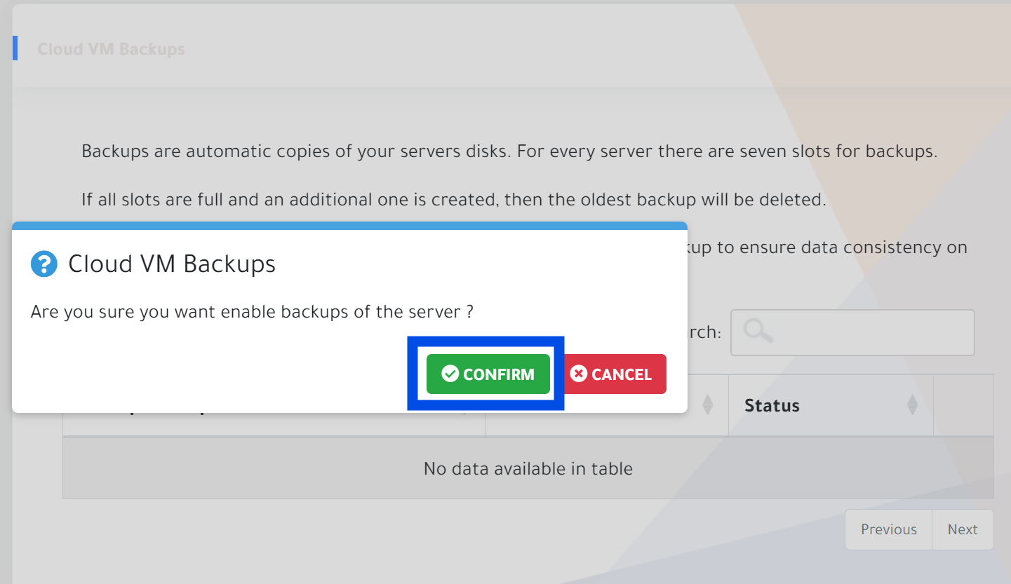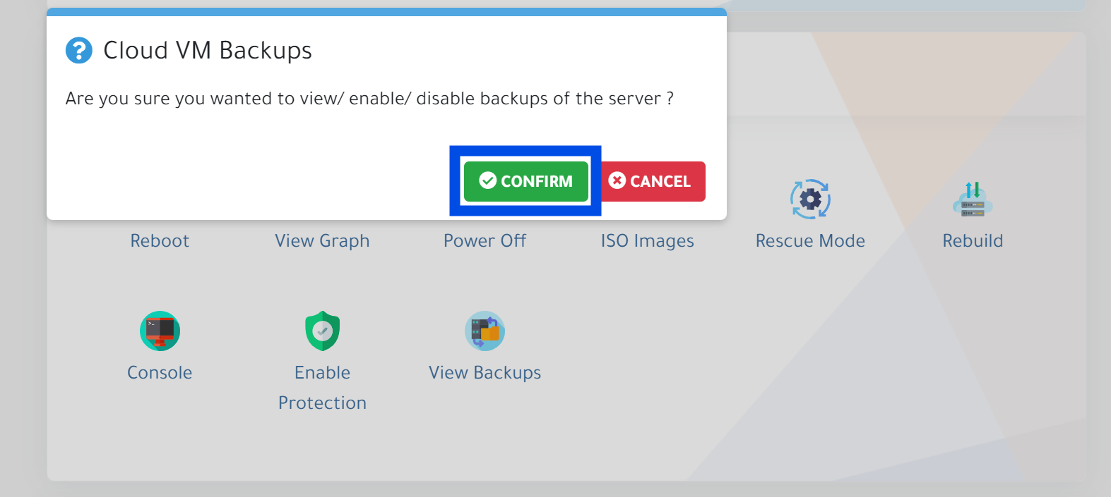 A confirmation dialog box will appear asking, "Are you sure you wanted to view/ enable/ disable backups of the server?". Click the green "CONFIRM" button to continue to the backup management page.